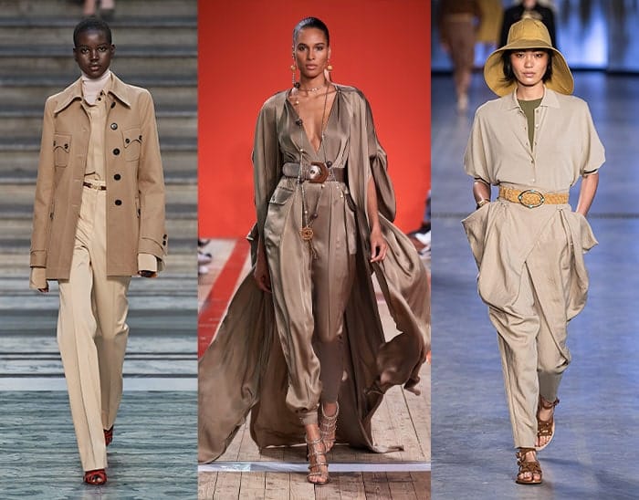 Certes, ces couleurs évoquent souvent l’automne, mais les créateurs ont décidé de les propulser sur les podiums estivaux. Pour donner un coup de frais à ces teintes, on les accompagne de détails turquoise ou dorés.