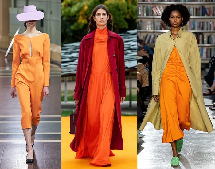 L’orange intense se hisse au rang des grandes tendances ce printemps. Les créateurs ont osé des associations inattendues, mariant l’orange à du violet pastel, du beige ou même du bordeaux, une teinte plus automnale habituellement.